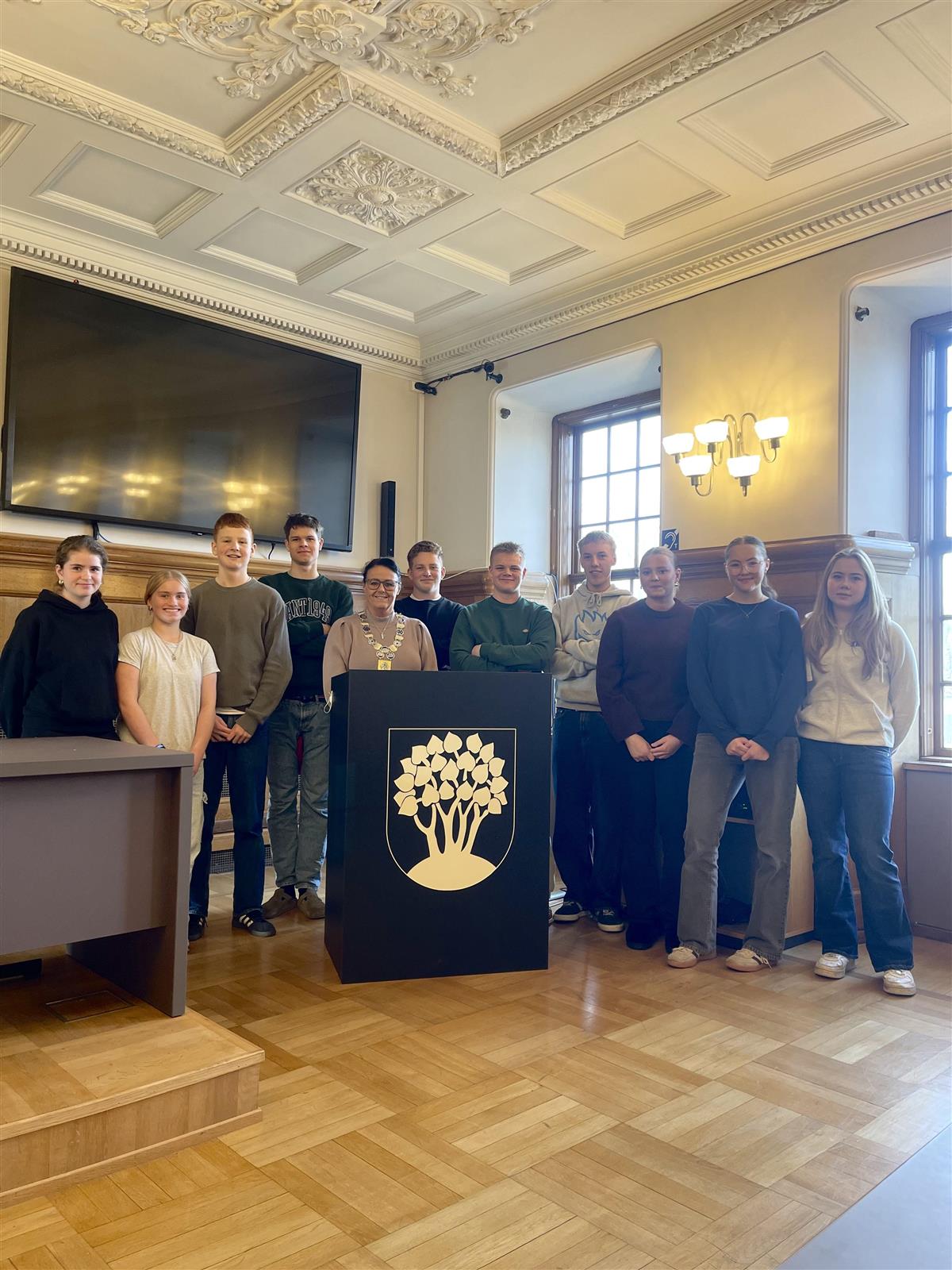 Fra venstre: Amalie Kristiansen, Isabella Gabrielsen (varamedlem), Tønnes Isaksen Torsøe, Richard Lui Buch, ordfører Ingrid M. Williamsen, Tidemand Isaksen Torsøe, nestleder Ola Håberg, Alexander Kleppe, leder Sara Johannessen, Ida Charman og Anna Tori Danielsen. Ikke tilstede da bildet ble tatt: Stella Brøvig, Ebbe Johnsen (varamedlem).