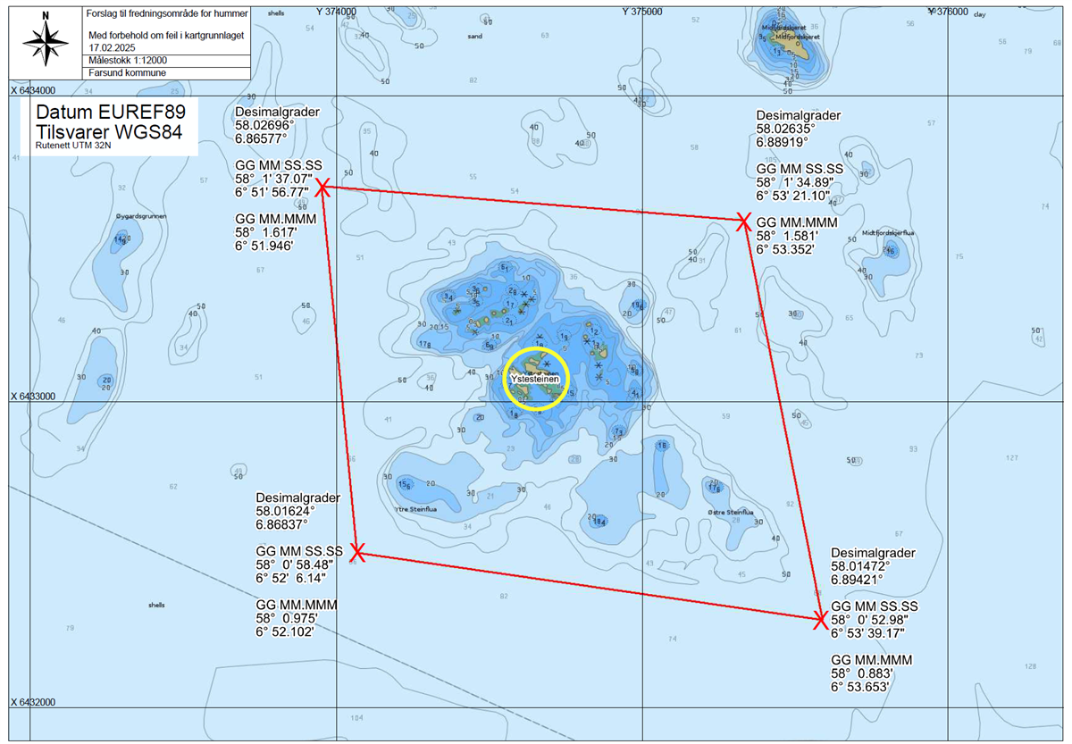 Ingen åpning for hummerfiske ved Ystesteinen fra 1. oktoberKommunen ønsker å informere om at det ikke er tillatt med hummerfiske i området Ystesteinen fra og med 1. oktober.Forbudsområdet er vist i kartet: