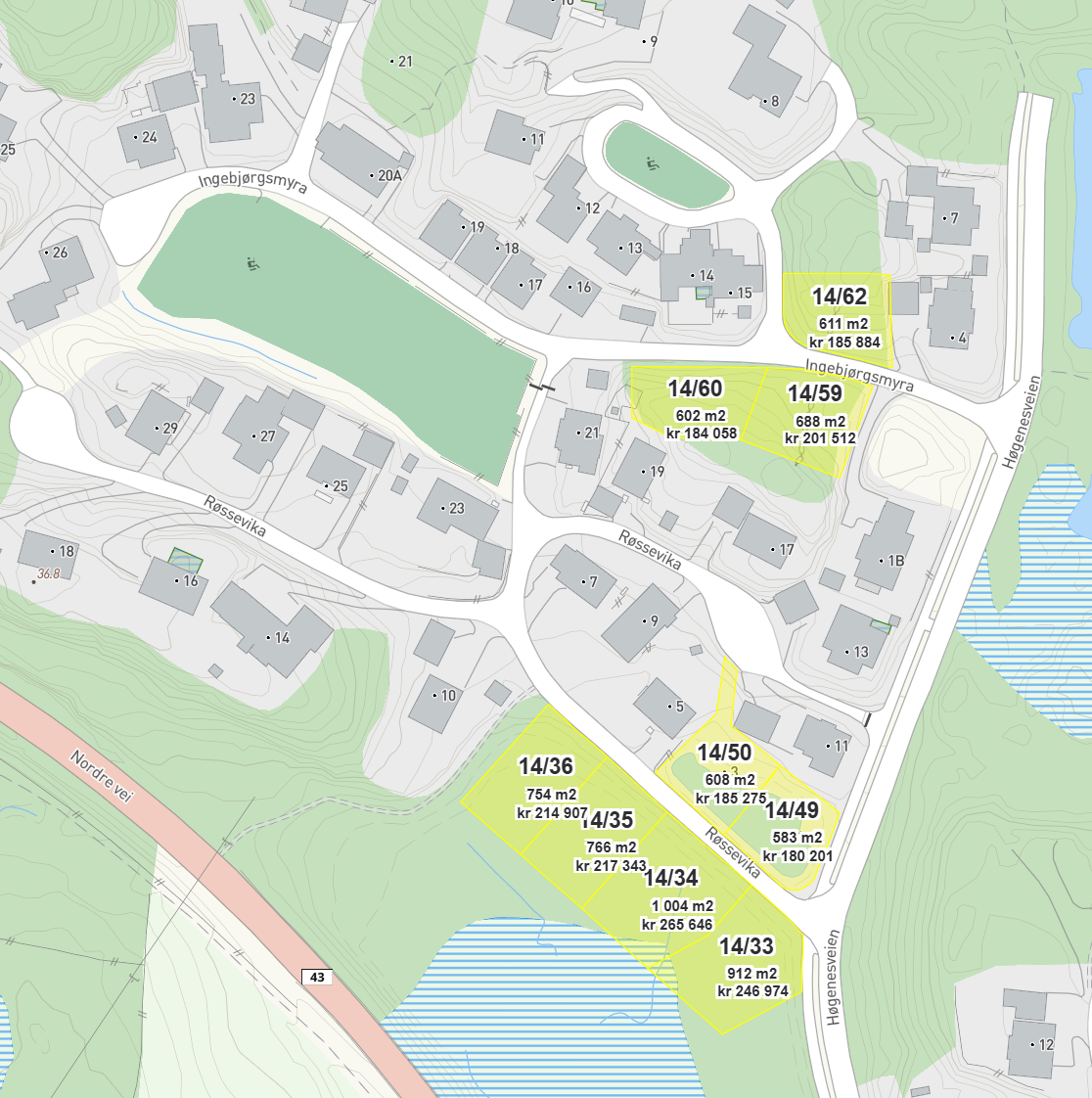 Ved interesse, fyll ut skjemaet “Kjøp av kommunal eiendom”. Utkast til kjøpekontrakt sendes ut raskt. Kjøpekontrakt må være inngått innen vanlig frist på 14 dager, ellers går tomten videre til andre interessenter.